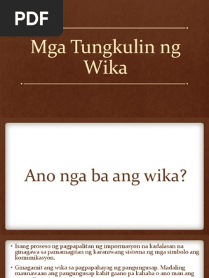 Mga tungkulin ng wika pdf. FIL101A- WIKA AT KULTURA SA MAPAYAPANG LIPUNAN PROF. Sinasabing ang mga naunang tao ay nakikipag-ugnayan sa isat isa sa pamamagitan ng mga tunog at ingay na kanilang nilikha. Fil11 -mga tungkulin ng wika 1 University of Santo Tomas.