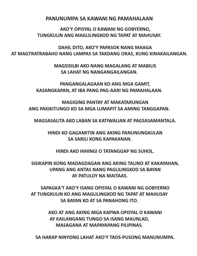 Ang panalangin ay paraan ng papuri sa Diyos. Ano-ano ang tungkulin ng lokal na pamahalaan sa pagtuyog ng pamahalaan tungkol sa pangangalaga sa ating likas na yaman. Panunumpa ng Lingkod-Bayan Ako ay isang lingkod bayan.